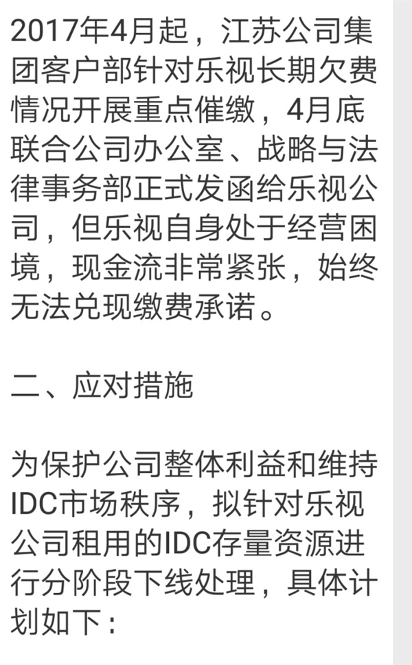文件显示,乐视是集团政企公司规定的TOP55重点互联网客户之一,目前在江苏公司南京、苏州、无锡三个地市合计租用30个机柜和290G带宽,自2016年7月起持续拖欠IDC资源租用费,截至2017年5月,全省合计欠费总额达1426.25万元,已严重损害公司利益。