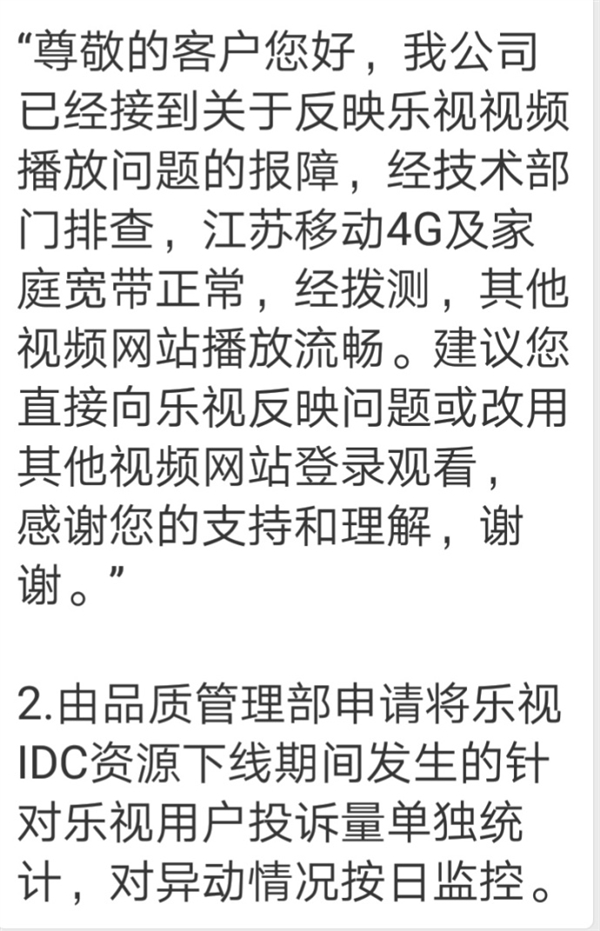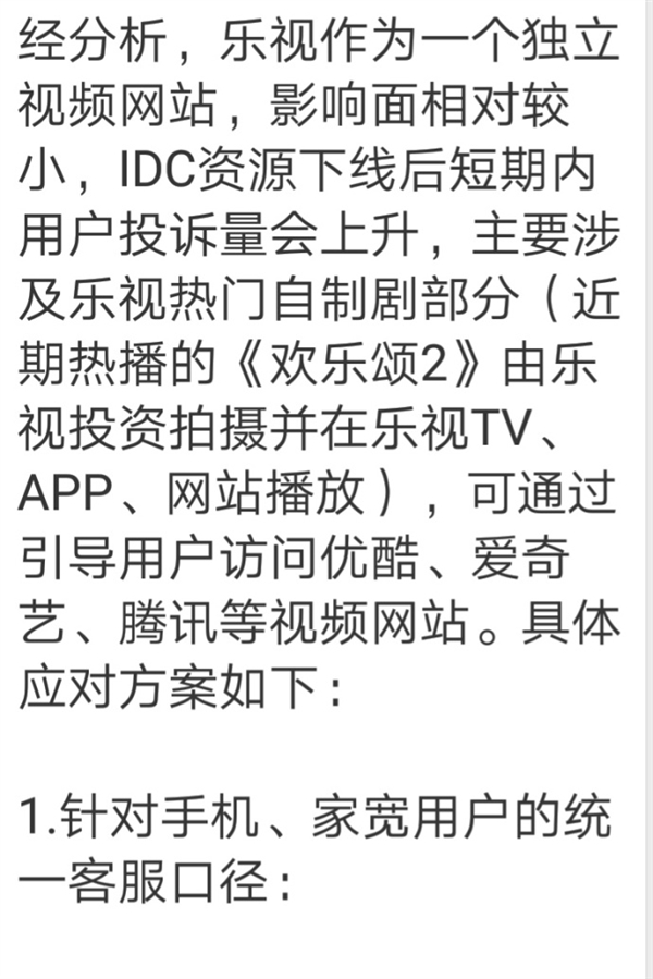 文件指出,IDC资源下线后,短期内用户投诉量会上升,主要涉及乐视热门自制剧部分,比如《欢乐颂2》。可通过引导用户访问优酷、爱奇艺等视频网站。