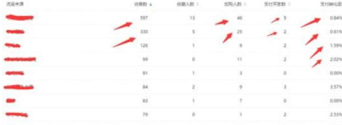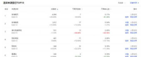 可以看到主要的的流量来源是首页流量和搜索流量,其中首页流量的加购率较低,所以我们后面想要得到更多的首页流量就要通过活动来增加首页的加购率,从而引入更多的首页流量,或者用直通车定向来精准首页的流量也是可以的。搜索流量整体数据反馈还是可以的,证明我们引流方向是没有问题的,但是搜索流量较少所以我们应当增加搜索流量的引入,点击详情就可以查看具体哪些关键词带来的流量,可以让我们去针对这些关键词用直通车引流。