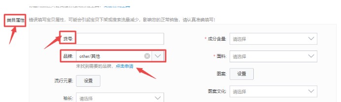 三、对于产品的类目属性,不同的类目也都是不一样的,对于产品的 货号,是卖家自己填写的,是方便卖家自己管理的,对于产品的品牌选项,如果有授权书或者是能够证明是正品的发票等,那就可以选择相应的品牌,如果没有,那就可以选择其他这个选项,防止被举报投诉售卖假货,这样容易对店铺造成严重影响,轻则扣分,重则可能会造成封店等等,所以我们对于这个的选项要慎重