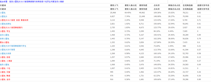 将一个核心词的数据延伸到极致,何为极致?在30个字的标题里以一个目标词为核心延伸出它的其他属性来进行组合。这种最精准,竞争数最小就是极致。这种做法弊端就是虽然属性很精准,竞争数小,但是只会覆盖到一个核心词的搜索人气。如 :链条小圆包女2017新款韩版简约斜挎百搭个性学生可爱迷你小清新。我们可以看到这个标题中只有小圆包一个核心词,其他的全部是属性词,读起来并不是很通顺,所有的词都是来修饰小圆包这个词。