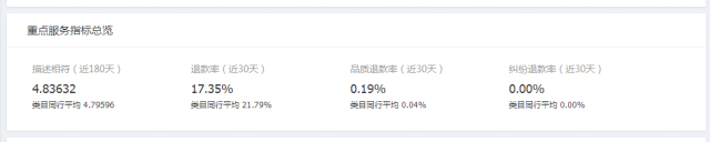 品质退款率:近30天内,品质相关退款原因退款成功笔数/支付宝支付子订单数,退款包括售中和售后的仅退款和退货退款。这个指标很重要,一方面可以看到你产品的品质问题,比如我这个截图,我的品质退货率明显就比行业均值的要高。