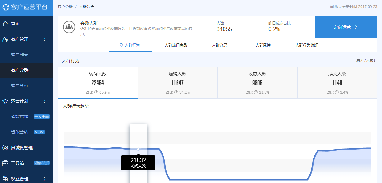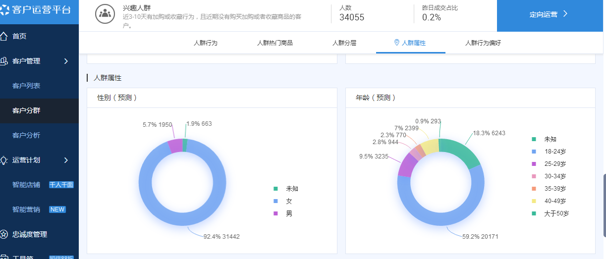 通过客户分析我们也已了解到客户各种细节的标签,对症下药也就更加容易见效。从不同人群在店铺的行为数据(访问、加购收藏、成交)可以识别什么人群是具有高转化潜力,或高成交额贡献的人群,可对他们进行重点运营;