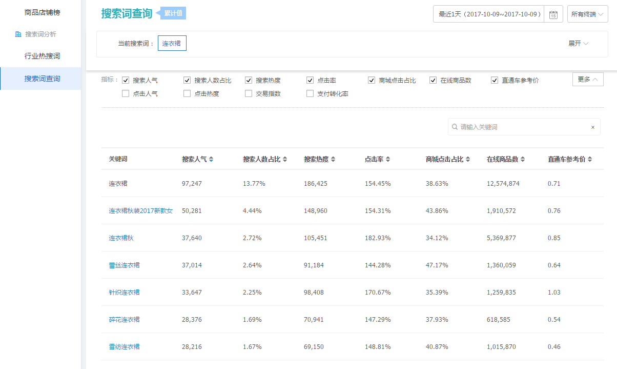 选好款之后,我们可以通过直通车去测一下我们选择的款的效果,首先进行选词,选择和自己宝贝匹配的关键词,一般如果你做的关键词的两天的总展现在5000左右,在这期间,注意均化每个关键词的展现,点击率基本高于行业平均值,那么基本上你的宝贝就具备爆款的潜质了,这样的宝贝就很容易做起来。