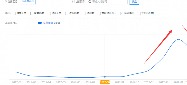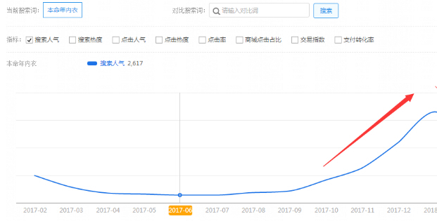 想要把握转季机会,首先必须要有一个清晰的全年产品架构,包括什么时候开始上新什么样款式,什么时候开始打造什么样的款式。举个例子:17年的内衣市场,本命年大红的内衣,十二月比十一月的搜索人气快速上升3倍,在一月达到最高峰,是十一月的4倍,在二月开始迅速下滑。