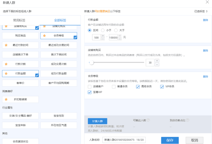 在创建人群的时候要根据你的目的和要求去创建,例如,如果你是想建立一个会员等级比较高的人群,那么你就可以从会员等级标签里面设定。