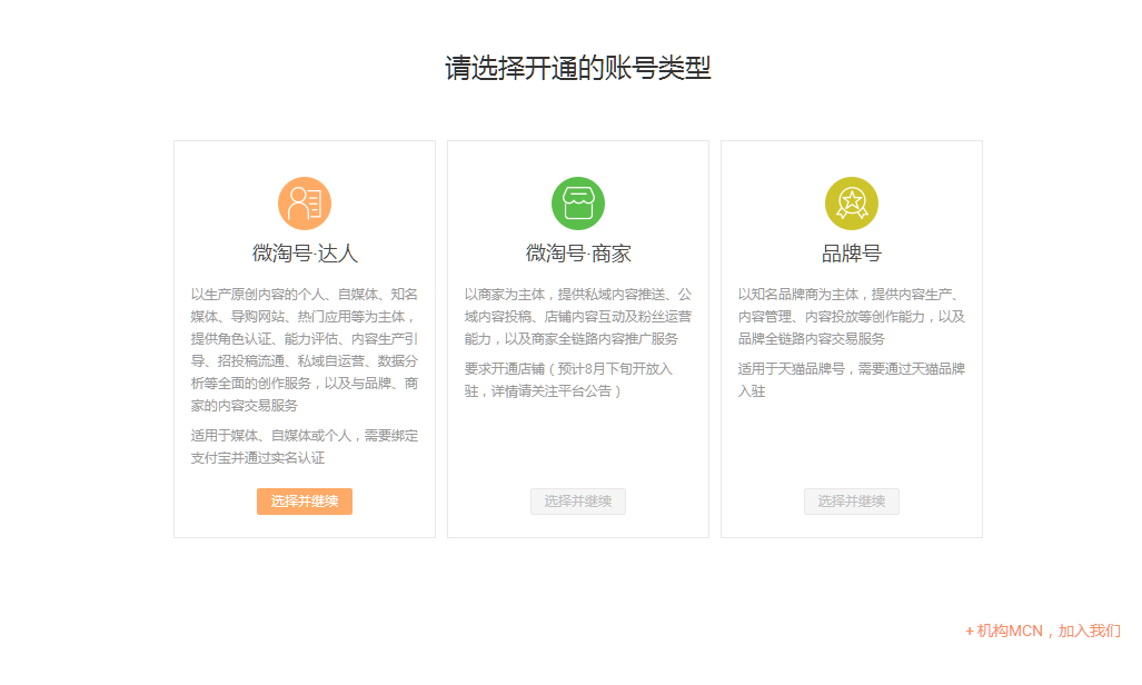 如果你是第一次登陆,会出现以下界面,微淘号,一般指的是纯达人号,或者双身份号(有店铺的达人号),微淘号商家指的就是开过店的账号了,品牌号一般是天猫品牌在这里注册。