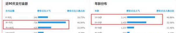 90天的支付金额,可以查看客单价平均保持在什么水平,年龄分布可以准确的推测出我们店铺的消费人群。有了这些数据,在经过一段时间的分析观察,人群基本就可以定位准确了。